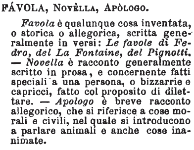 | Favola, Novella, Apologo - Favola è qualunque cosa inventata, o storica o allegorica, scritta generalmente in versi: Le favole di Fedro, del La Fontaine, del Pignotti. - Novella è racconto generalmente scritto in prosa, e concernente fatti speciali a una persona, o bizzarrie e capricci, fatto col proposito di dilettare. - Apologo è breve racconto allegorico, che si riferisce a cose morali e civili, nel quale si introducono a parlare animali e anche cose inanimate. [immagine] |