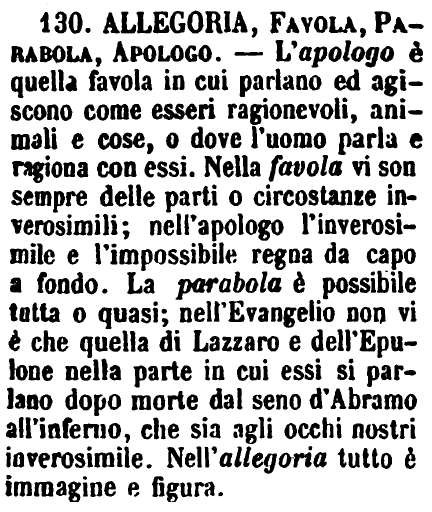| Allegoria, Favola, Parabola, Apologo - L'apologo è quella favola in cui parlano ed agiscono come esseri ragionevoli, animali e cose, o dove l'uomo parla e ragiona con essi. Nella favola vi son sempre delle parti o circostanze inverosimili; nell'apologo l'inverosimile e l'impossibile regna da capo a fondo. La parabola è possibile tutta o quasi; nell'Evangelio non vi è che quella di Lazzaro e dell'Epulone nella parte in cui essi si parlano dopo morte dal seno d'Abramo all'inferno, che sia agli occhi nostri inverosimile. Nell'allegoria tutto è immagine e figura. [immagine] |