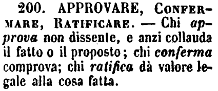 | Approvare, Confermare, Ratificare - Chi approva non dissente, e anzi collauda il fatto o il proposto; chi conferma comprova; chi ratifica dà valore legale alla cosa fatta. [immagine] |