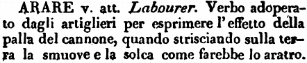 | Arare - v. att. Labourer. Verbo adoperato dagli artiglieri per esprimere l'effetto della palla del cannone, quando strisciando sulla terra la smuove e la solca come farebbe lo aratro. [immagine] |