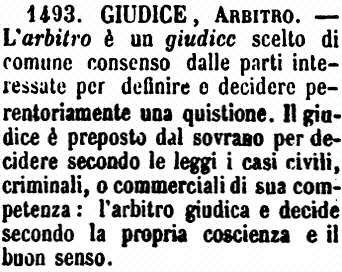 | Giudice, Arbitro - L'arbitro è un giudice scelto di comune consenso dalle parti interessate per definire e decidere perentoriamente una quistione. Il giudice è preposto dal sovrano per decidere secondo le leggi i casi civili, criminali, o commerciali di sua competenza: l'arbitro giudica e decide secondo la propria coscienza e il buon senso. [immagine] |