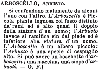 | Arboscello, Arbusto - Si confondono malamente da alcuni l'uno con l'altro. L'Arboscello è Piccola pianta legnosa col fusto distinto da' rami ed è alto quasi il doppio della statura d'un uomo; l'Arbusto invece si ramifica sin dal piede ed è inferiore alla statura d'un uomo. L'Arboscello è un albero piccolo; l'Arbusto è una specie di cespuglio alto. Si può avere un boschetto d'arboscelli; una macchia, una siepe d'arbusti. - G. F.] [immagine] |