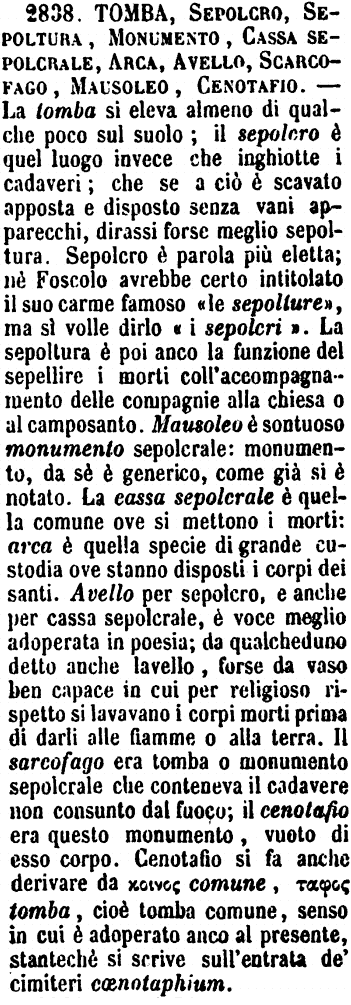 | Tomba, Sepolcro, Sepoltura, Monumento, Cassa sepolcrale, Arca, Avello, Scarcofago, Mausoleo, Cenotafio - La tomba si eleva almeno di qualche poco sul suolo; il sepolcro è quel luogo invece che inghiotte i cadaveri; che se a ciò è scavato apposta e disposto senza vani apparecchi, dirassi forse meglio sepoltura. Sepolcro è parola più eletta; nè Foscolo avrebbe certo intitolato il suo carme famoso «le sepolture», ma sì volle dirlo «i sepolcri». La sepoltura è poi anco la funzione del sepellire i morti coll'accompagnamento delle compagnie alla chiesa o al camposanto. Mausoleo è sontuoso monumento sepolcrale: monumento, da sè è generico, come già si è notato. La cassa sepolcrale è quella comune ove si mettono i morti: arca è quella specie di grande custodia ove stanno disposti i corpi dei santi. Avello per sepolcro, e anche per cassa sepolcrale, è voce meglio adoperata in poesia; da qualcheduno detto anche lavello, forse da vaso ben capace in cui per religioso rispetto si lavavano i corpi morti prima di darli alle fiamme o alla terra. Il sarcofago era tomba o monumento sepolcrale che conteneva il cadavere non consunto dal fuoco; il cenotafio era questo monumento, vuoto di esso corpo. Cenotafio si fa anche derivare da χοινος comune, ταφος tomba, cioè tomba comune, senso in cui è adoperato anco al presente, stantechè si scrive sull'entrata de' cimiteri coenotaphium. [immagine] |