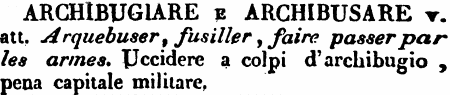 | Archibugiare e Archibusare - v. att. Arquebuser, fusiller, faire passer par les armes. Uccidere a colpi d'archibugio, pena capitale militare. [immagine] |