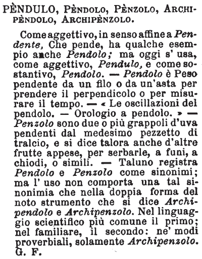 | Pendulo, Pendolo, Penzolo, Archipendolo, Archipenzolo - Come aggettivo, in senso affine a Pendente, Che pende, ha qualche esempio anche Pendolo; ma oggi s' usa, come aggettivo, Pendulo, e come sostantivo, Pendolo. - Pendolo è Peso pendente da un filo o da un'asta per prendere il perpendicolo o per misurare il tempo. - «Le oscillazioni del pendolo. - Orologio a pendolo.» - Penzolo sono due o più grappoli d'uva pendenti dal medesimo pezzetto di tralcio, e si dice talora anche d'altre frutte appese, per serbarle, a funi, a chiodi, o simili. - Taluno registra Pendolo e Penzolo come sinonimi; ma l'uso non comporta una tal sinonimia che nella doppia forma del noto strumento che si dice Archipendolo e Archipenzolo. Nel linguaggio scientifico più comune il primo; nel familiare, il secondo: ne' modi proverbiali, solamente Archipenzolo. G. F. [immagine] |