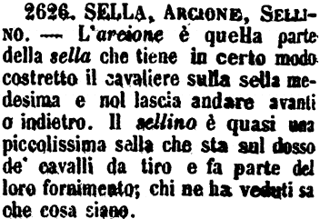 | Sella, Arcione, Sellino - L'arcione è quella parte della sella che tiene in certo modo costretto il cavaliere sulla sella medesima e nol lascia andare avanti o indietro. Il sellino è quasi una piccolissima sella che sta sul dosso de' cavalli da tiro e fa parte del loro fornimento; chi ne ha veduti sa che cosa siano. [immagine] |