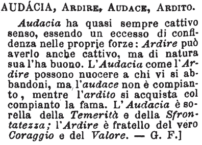 | Audacia, Ardire, Audace, Ardito - Audacia ha quasi sempre cattivo senso, essendo un eccesso di confidenza nelle proprie forze: Ardire può averlo anche cattivo, ma di natura sua l'ha buono. L'Audacia come l'Ardire possono nuocere a chi vi si abbandoni, ma l'audace non è compianto, mentre l'ardito si acquista col compianto la fama. L'Audacia è sorella della Temerità e della Sfrontatezza; l'Ardire è fratello del vero Coraggio e del Valore. - G. F.] [immagine] |
