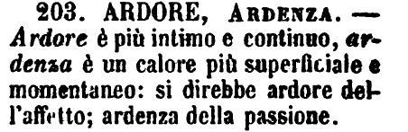 Ardore, Ardenza - Ardore è più intimo e continuo, ardenza è un calore più superficiale e momentaneo: si direbbe ardore dell'affetto; ardenza della passione. [immagine]