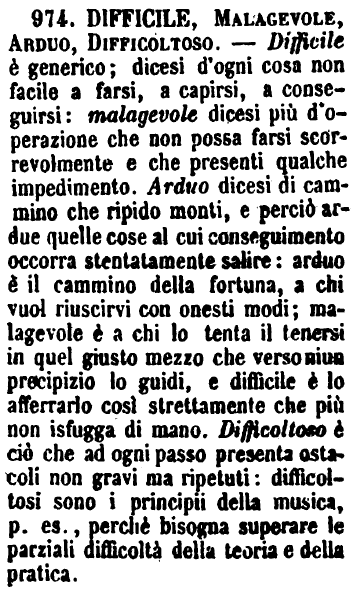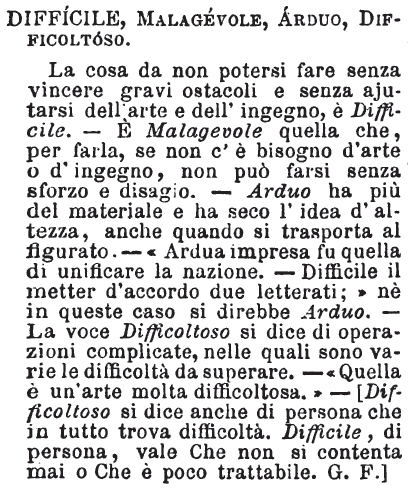 | Difficile, Malagevole, Arduo, Difficoltoso - La cosa da non potersi fare senza vincere gravi ostacoli e senza ajutarsi dell'arte e dell'ingegno, è Difficile. - E' Malagevole quella che, per farla, se non c'è bisogno d'arte o d'ingegno, non può farsi senza sforzo e disagio. - Arduo ha più del materiale e ha seco l'idea d'altezza, anche quando si trasporta al figurato. - «Ardua impresa fu quella di unificare la nazione. - Difficile il metter d'accordo due letterati;» nè in questo caso di direbbe Arduo. - La voce Difficoltoso si dice di operazioni complicate, nelle quali sono varie le difficoltà da superare. - «Quella è un'arte molto difficoltosa.» - [Difficoltoso si dice anche di persona che in tutto trova difficoltà. Difficile, di persona, vale Che non si contenta mai o Che è poco trattabile. G. F.] [immagine] |