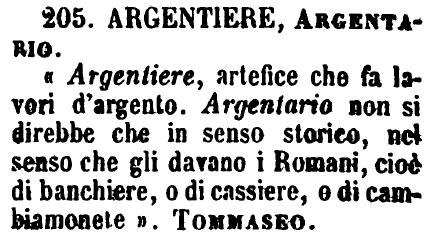 | Argentiere, Argentario - « Argentiere, artefice che fa lavori d'argento. Argentario non si direbbe che in senso storico, nel senso che gli davano i Romani, cioè di banchiere, o di cassiere, o di cambiamonete ». Tommaseo. [immagine] |