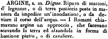 | Argine - s. m. Digue. Riparo di mattoni, di legname, o di terra posticcia posta in maniera da impedire un'inondazione, o da deviare il corso dell'acqua. - I Romani chiamavano argine un approccio, che facevano scavando la terra ed alzandola in forma di bastione piatto, o di cavaliere. [immagine] |