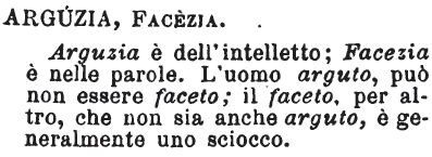 | Arguzia, Argutezza, Facezia - Argutezza è propensione alle arguzie, a abito. Arguzia è detto spiritoso, frizzante. Facezia è motto scherzevole. [immagine] |