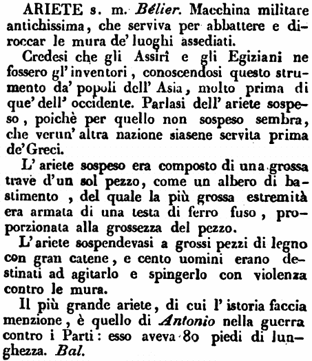 Ariete - Si dava questo nome ad una Macchina da guerra, da cui gli antichi si servivano negli assedj. Era una trave di una lunghezza e grossezza enorme, la cui estremità era armata d'una testa di ferro proporzionata al resto, ed avente la figura d'un Ariete. Questa trave era sospesa e tenuta in equilibrio con una catena o grossi canapi, che la sostenevano in aria mediante un'altra macchina, che si faceva avanzare col mezzo di rulli o di più ruote. Questa terribil macchina, che necessariamente bisognava far avvicinare a poca distanza dal muro, che si voleva battere, era difesa dai dardi degli assediati atteso l'essere dappertutto coperta. L'Ariete così bilanciato era agevolmente messo in moto, e scuotendo fortemente faceva crollare ben presto al muro, che ne veniva urtato con violenza.