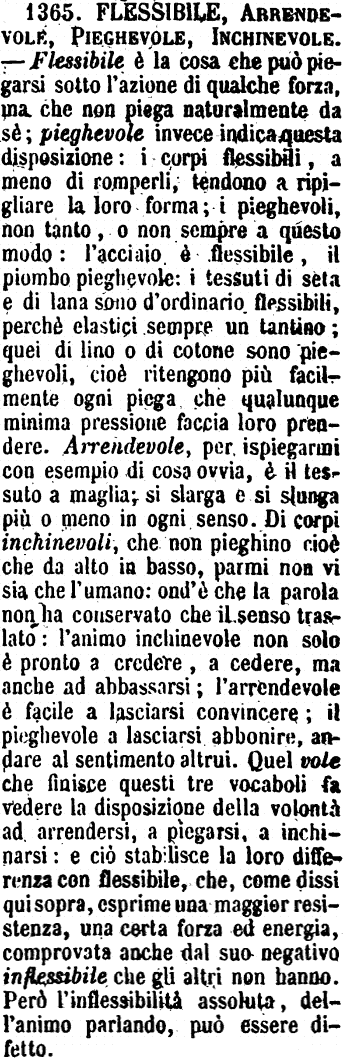 | Flessibile, Arrendevole, Pieghevole, Inchinevole - Flessibile è la cosa che può piegarsi sotto l'azione di qualche forza, ma che non piega naturalmente da sè; pieghevole invece indica questa disposizione: i corpi flessibili, a meno di romperli, tendono a ripigliare la loro forma; i pieghevoli, non tanto, o non sempre a questo modo: l'acciaio è flessibile, il piombo pieghevole: i tessuti di seta e di lana sono d'ordinario flessibili, perchè elastici sempre un tantino; quei di lino o di cotone sono pieghevoli, cioè ritengono più facilmente ogni piega che qualunque minima pressione faccia loro prendere. Arrendevole, per ispiegarmi con esempio di cosa ovvia, è il tessuto a maglia; si slarga e si slunga più o meno in ogni senso. Di corpi inchinevoli, che non pieghino cioè che da alto in basso, parmi non vi sia che l'umano: ond'è che la parola non ha conservato che il senso traslato: l'animo inchinevole non solo è pronto a credere, a cedere, ma anche ad abbassarsi; l'arrendevole è facile a lasciarsi convincere; il pieghevole a lasciarsi abbonire, andare al sentimento altrui. Quel vole che finisce questi tre vocaboli fa vedere la disposizione della volontà ad arrendersi, a piegarsi, a inchinarsi: e ciò stabilisce la loro differenza con flessibile, che, come dissi qui sopra, esprime una maggior resistenza, una certa forza ed energia, comprovata anche dal suo negativo inflessibile che gli altri non hanno. Però l'inflessibilità assoluta, dell'animo parlando, può essere difetto. [immagine] |