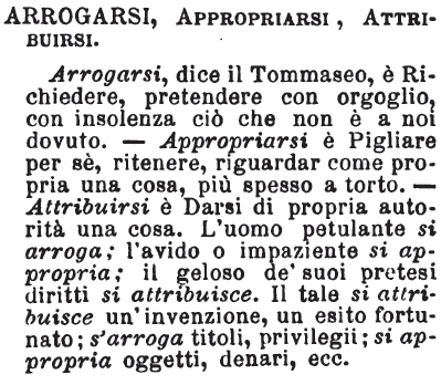| Arrogarsi, Appropriarsi, Attribuirsi - Arrogarsi, dice il Tommaseo, è Richiedere, pretendere con orgoglio, con isolenza ciò che non è a noi dovuto. - Appropriarsi è Pigliare per sè, ritenere, rigaurdar come propria cosa, più spesso a torto. - Attribuirsi è Darsi di propria autorità una cosa. L'uomo petulante si arroga; l'avido o impaziente si appropria; il geloso de' suoi pretesi diritti si attribuisce. Il tale si attribuisce un'invenzione, un esito fortunato; s'arroga titoli, privilegii; si appropria oggetti, denari, ecc. [immagine] |