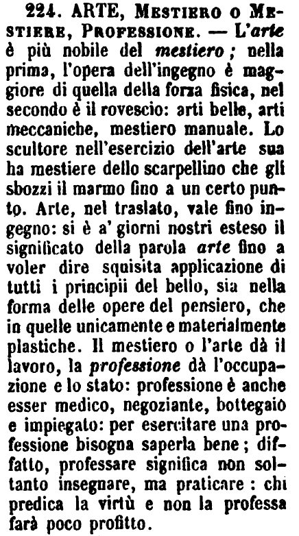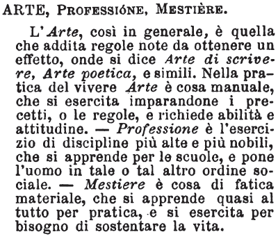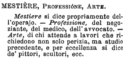 | Mestiere, Professione, Arte - Mestiere si dice propriamente dell'operajo. - Professione, del negoziante, del medico, dell'avvocato. - Arte, di chi attende a lavori che richiedono non solo perizia, ma studio precedente, e per eccellenza si dice de' pittori, scultori, ecc. [immagine] |