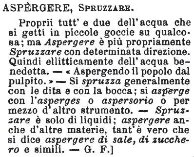 | Aspergere, Spruzzare - Proprii tutt'e due dell'acqua che si getti in piccole goccie su qualcosa; ma Aspergere è più propriamente Spruzzare con determinata direzione. Quindi ellitticamente dell'acqua benedetta. - «Aspergendo il popolo dal pulpito.» - Si spruzza generalmente con le dita e con la bocca; si asperge con l'asperges o aspersorio o per mezzo d'altro strumento. - Spruzzare è solo di liquidi; aspergere anche d'altre materie, tant'è vero che si dice aspergere di sale, di zucchero e simili. - G. F. [immagine] |