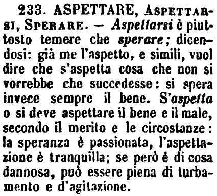 | Aspettare, Aspettarsi, Sperare - Aspettarsi è piuttosto temere che sperare; dicendosi: già me l'aspetto, e simili, vuol dire che s'aspetta cosa che non si vorrebbe che succedesse: si spera invece sempre il bene. S'aspetta o si deve aspettare il bene e il male, secondo il merito e le circostanze: la speranza è passionata, l'aspettazione è tranquilla; se però è di cosa dannosa, può essere piena di turbamento e d'agitazione. [immagine] |