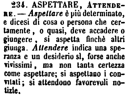 | Aspettare, Attendere - Aspettare è più determinato, e dicesi di cosa o persona che certamente, o quasi, deve accedere o giungere, si aspetta finchè altri giunga. Attendere indica una speranza e un desiderio sì, forse anche vivissimi, ma non tanta certezza come aspettare; si aspettano i convitati; si attendono favorevoli notizie. [immagine] |