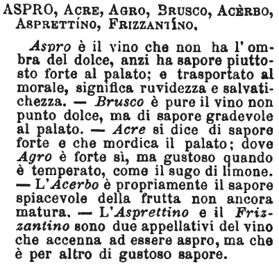 | Aspro, Acre, Agro, Brusco, Acerbo, Asprettino, Frizzantino - Aspro è il vino che non ha l'ombra del dolce, anzi ha sapore piuttosto forte al palato; e trasportato al morale, significa ruvidezza e salvatichezza. - Brusco è pure il vino non punto dolce, ma di sapore gradevole al palato. - Acre si dice di sapore forte e che mordica il palato; dove Agro è forte sì, ma gustoso quando è temperato, come il sugo di limone. - L'Acerbo è propriamente il sapore spiacevole della frutta non ancora matura. - L'Asprettino e il Frizzantino sono due appellativi del vino che accenna ad essere aspro, ma che è per altro di gustoso sapore. [immagine] |