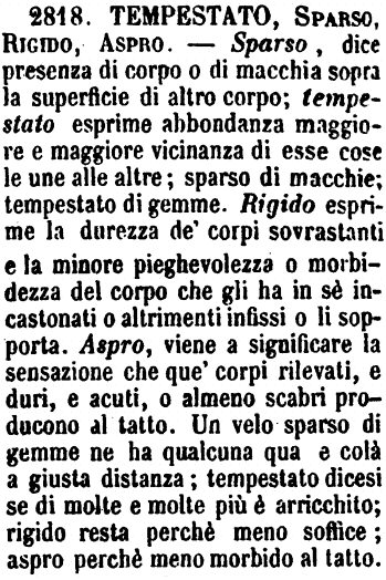 | Tempestato, Sparso, Rigido, Aspro - Sparso, dice presenza di corpo o di macchia sopra la superficie di altro corpo; tempestato esprime abbondanza maggiore e maggiore vicinanza di esse cose le une alle altre; sparso di macchie; tempestato di gemme. Rigido esprime la durezza de' corpi sovrastanti e la minore pieghevolezza o morbidezza del corpo che gli ha in sè incastonati o altrimenti infissi o li sopporta. Aspro, viene a significare la sensazione che que' corpi rilevati, e duri, e acuti, o almeno scabri producono al tatto. Un velo sparso di gemme ne ha qualcuna qua e colà a giusta distanza; tempestato dicesi se di molte e molte più è arricchito; rigido resta perchè meno soffice; aspro perchè meno morbido al tatto. [immagine] |