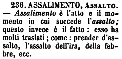 | Assalimento, Assalto - Assalimento è l'atto e il momento in cui succede l'assalto; questo invece è il fatto: esso ha molti traslati; come: prender d'assalto, l'assalto dell'ira, della febbre, ecc. [immagine] |