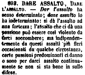 | Dare assalto, Dare l’assalto - Dar l'assalto ha senso determinato; dare assalto lo ha indeterminato: si dà l'assalto ad una fortezza; l'assalto che ci dà una passione può essere così violento da farci soccombere; ma indipendentemente da questi assalti più fieri occasionati da qualche circostanza, certe passioni predominanti ci danno o sono per darci assalto continuamente se non si sta bene in sulle difese. [immagine] |
