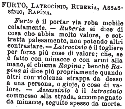 | Furto, Latrocinio, Ruberia, Assassinio, Rapina - Furto è il portar via roba mobile celatamente. - Ruberia si dice di cosa che abbia molto valore, e sottratta palesamente, non potendo altri contrastare. - Latrocinio è il togliere per forza più cose di valore; che, se è fatto con minacce e con armi alla mano, si chiama Rapina; benchè Rapina si dice più propriamente quando altri con violenza strappa da dosso a una persona, o gioje, o cose di valore. - Assassinio è il latrocinio commesso alla strada, accompagnato da minacce, seguito spesso da morte. [immagine] |