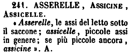 | Usando "assicine" (*) si possono ottenere i seguenti risultati: buccine * = bucassi; calcine * = calassi; forcine * = forassi; * deraciné = assidera; azioncine * = azionassi; coroncine * = coronassi; campioncine * = campionassi; frazioncine * = frazionassi; pensioncine * = pensionassi; stazioncine * = stazionassi; dilazioncine * = dilazionassi; questioncine * = questionassi. |