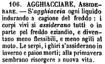 | Agghiacciare, Assiderare - S'agghiaccia ogni liquido indurando a cagione del freddo: i corpi vivi si assiderano tutti o in parte pel freddo eziandio, e diventano meno flessibili, e meno agili al moto. Le serpi, i ghiri s'assiderano in inverno e paion morti; alla primavera sembrano risorgere a nuova vita. [immagine] |