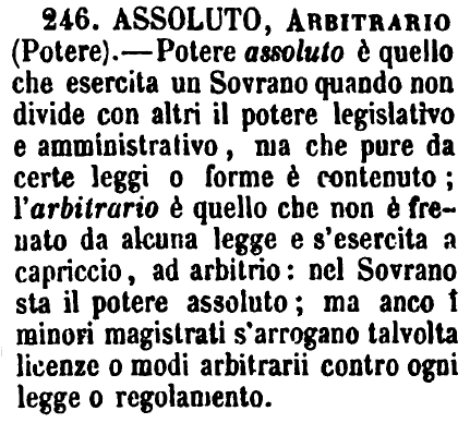 | Assoluto, Arbitrario (Potere) - Potere assoluto è quello che esercita un Sovrano quando non divide con altri il potere legislativo e amministrativo, ma che pure da certe leggi o forme è contenuto; l'arbitrario è quello che non è frenato da alcuna legge e s'esercita a capriccio, ad arbitrio: nel Sovrano sta il potere assoluto; ma anco i minori magistrati s'arrogano talvolta licenze o modi arbitrarii contro ogni legge o regolamento. [immagine] |