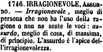 | Irragionevole, Assurdo - Irragionevole, meglio di persona che non ha l'uso della ragione o non ne sente le voci: assurdo, meglio di cosa, di massima, di principio. L'assurdo è l'apice dell'irragionevolezza. [immagine] |
