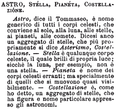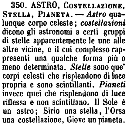 | Astro, Stella, Pianeta, Costellazione - Astro, dice il Tommaseo, è nome generico di tutti i corpi celesti, che conviene al sole, alla luna, alle stelle, ai pianeti, alle comete. Dicesi anco un aggregato di stelle, che più propriamente si dice Asterismo, Costellazione. - Stella è qualunque corpo celeste, il quale brilli di propria luce; sicchè la luna, per esempio, non è una stella. - Pianeta è nome dei corpi celesti erranti; ma specialmente di quelli che si muovono quasi visibilmente. - Costellazione è, come ho detto, un aggregato di stelle, che ha figura e nome particolare appresso gli astronomi. [immagine] |
