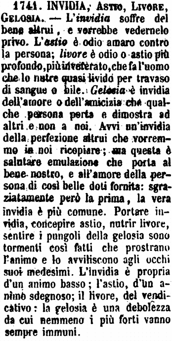 | Invidia, Astro, Livore, Gelosia - L'invidia soffre del bene altrui, e vorrebbe vedernelo privo. L'astio è odio amaro contro la persona; livore è odio o astio più profondo, più inveterato, che fa l'uomo che lo nutre quasi livido per travaso di sangue o bile. Gelosia è invidia dell'amore o dell'amicizia che qualche persona porta e dimostra ad altri e non a noi. Avvi un'invidia della perfezione altrui che vorremmo in noi ricopiare; ma questa è salutare emulazione che porta al bene nostro e all'amore della persona di così belle doti fornita: sgraziatamente però la prima, la vera invidia è più comune. Portare invidia, concepire astio, nutrir livore, sentire i pungoli della gelosia sono tormenti così fatti che prostrano l'animo e lo avviliscono agli occhi suoi medesimi. L'invidia è propria d'un animo basso; l'astio, d'un animo sdegnoso; il livore, del vendicativo: la gelosia è una debolezza da cui nemmeno i più forti vanno sempre immuni. [immagine] |