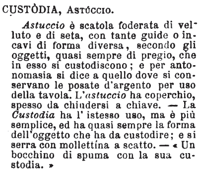 | Custodia, Astuccio - Astuccio è scatola foderata di velluto e di seta, con tante guide o incavi di forma diversa, secondo gli oggetti, quasi sempre di pregio, che in esso si custodiscono; e per antonomasia si dice a quello dove si conservano le posate d'argento per uso della tavola. L'astuccio ha coperchio, spesso da chiudersi a chiave. - La Custodia ha l'istesso uso, ma è più semplice, ed ha quasi sempre la forma dell'oggetto che ha da custodire; e si serra con mollettina a scatto. - «Un bocchino di spuma con la sua custodia.» [immagine] |