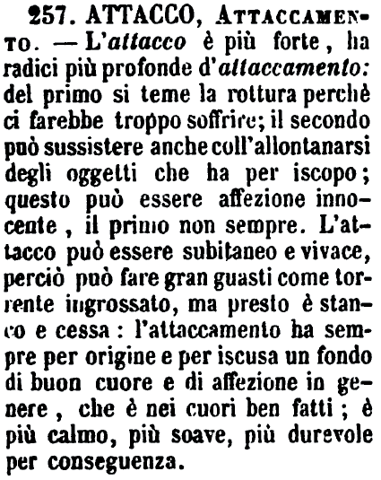| Attacco, Attaccamento - L'attacco è più forte, ha radici più profonde d'attaccamento: del primo si teme la rottura perchè ci farebbe troppo soffrire; il secondo può sussistere anche coll'allontanarsi degli oggetti che ha per iscopo; questo può essere affezione innocente, il primo non sempre. L'attacco può essere subitaneo e vivace, perciò può fare gran guasti come torrente ingrossato, ma presto è stanco e cessa: l'attaccamento ha sempre per origine e per iscusa un fondo di buon cuore e di affezione in genere, che è nei cuori ben fatti; è più calmo, più soave, più durevole per conseguenza. [immagine] |