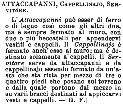 | Attaccapanni, Cappellinajo, Servitore - L'attaccapanni può esser di ferro o di legno così come gli altri due, ma è sempre fermato al muro, con due o più beccatelli per appendervi vestiti e cappelli. Cappellinajo è fermato anch'esso al muro; ma è destinato solamente a' cappelli. Il servitore serve da attaccapanni e da cappellinajo essendo formato da un'asta che sta ritta per mezzo di tre o quattro piedi che posano sul terreno e dalla quale partono dal mezzo in su varii bracci destinati ad appiccarvi vesti e cappelli. - G. F. [immagine] |