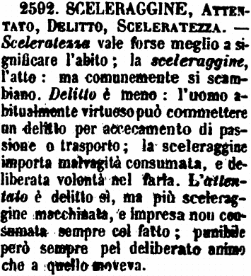 | Sceleraggine, Attentato, Delitto, Sceleratezza - Sceleratezza vale forse meglio a significare l'abito; la sceleraggine, l'atto: ma comunemente si scambiano. Delitto è meno: l'uomo abitualmente virtuoso può commettere un delitto per accecamento di passione o trasporto; la sceleraggine importa malvagità consumata, e deliberata volontà nel farla. L'attentato è delitto sì, ma più sceleraggine macchinata, e impresa non consumata sempre col fatto; punibile però sempre pel deliberato animo che a quello moveva. [immagine] |