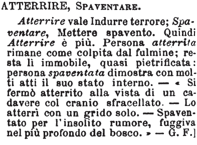 | Atterrire, Spaventare - Atterrire vale Indurre terrore; Spaventare, Mettere spavento. Quindi Atterrire è più. Persona atterrita rimane come colpita dal fulmine; resta lì immobile, quasi pietrificata: persona spaventata dimostra con molti atti il suo stato interno. - «Si fermò atterrito alla vista di un cadavere col cranio sfracellato. - Lo atterrì con un grido solo. - Spaventato per l'insolito rumore, fuggiva nel più profondo del bosco.» - G. F.] [immagine] |