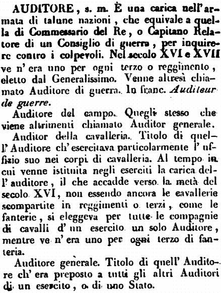 | Auditore - s. m. È una carica nell'armata di talune nazioni, che equivale a quella di Commessario del Re, o Capitano Relatore di un Consiglio di guerra, per inquirere contro i colpevoli. Nel secolo XVI e XVII ve n'era uno per ogni terzo o reggimento, eletto dal Generalissimo. Venne altresì chiamato Auditore di guerra. In franc. Auditeur de guerre.