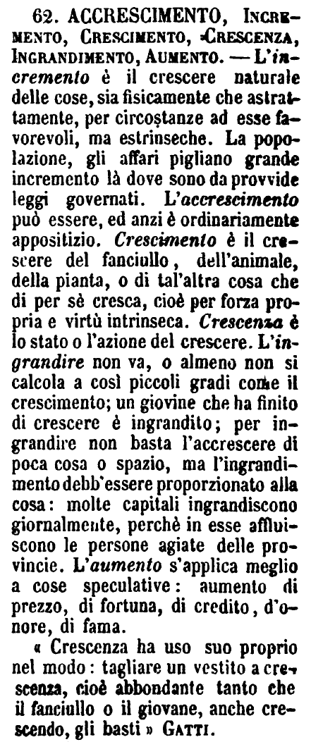 | Accrescimento, Incremento, Crescimento, Crescenza, Ingrandimento, Aumento - L’incremento è il crescere naturale delle cose, sia fisicamente che astrattamente, per circostanze ad esse favorevoli, ma estrinseche. La popolazione, gli affari pigliano grande incremento là dove sono da provvide leggi governati. L’accrescimento può essere, ed anzi è ordinariamente appositizio. Crescimento è il crescere del fanciullo, dell’animale, della pianta, o di tal’altra cosa che di per sè cresca, cioè per forza propria e virtù intrinseca. Crescenza è lo stato o l’azione del crescere. L’ingrandire non va, o almeno non si calcola a così piccoli gradi come il crescimento; un giovine che ha finito di crescere è ingrandito; per ingrandire non basta l’accrescere di poca cosa o spazio, ma l’ingrandimento debb’essere proporzionato alla cosa: molte capitali ingrandiscono giornalmente, perchè in esse affluiscono le persone agiate delle provincie. L’aumento s’applica meglio a cose speculative: aumento di prezzo, di fortuna, di credito, d’onore, di fama.