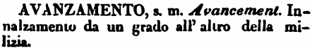 | Avanzamento - s. m. Avancement. Innalzamento da un grado all'altro della milizia. [immagine] |