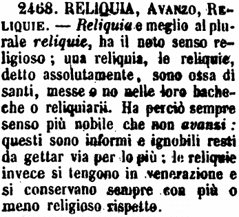 | Reliquia, Avanzo, Reliquie - Reliquia, e meglio al plurale Reliquie, ha il noto senso religioso. Una reliquia, Le reliquie, detto assolutamente, sono ossa di Santi, messe o no nelle loro custodie o reliquiarii. Ha perciò sempre senso più nobile che non Avanzi; questi sono informi e ignobili resti da gettar via per lo più; le Reliquie, invece, si tengono in venerazione e si conservano sempre con più o meno religioso rispetto. [immagine] |