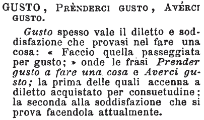 | Gusto, Prenderci gusto, Averci gusto - Gusto spesso vale il diletto e soddisfazione che provasi nel fare una cosa: «Faccio quella passeggiata per gusto;» onde le frasi Prender gusto a fare una cosa e Averci gusto; la prima delle quali accenna a diletto acquistato per consuetudine; la seconda alla soddisfazione che si prova facendola attualmente. [immagine] |
