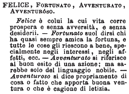 | Felice, Fortunato, Avventurato, Avventuroso - Felice è colui la cui vita corre prospera e senza avversità, e senza desiderii. - Fortunato suol dirsi chi ha quasi sempre amica la fortuna, e tutte le cose gli riescono a bene, specialmente negli interessi, negli affetti, ecc. - Avventurato si riferisce al buon esito di una azione; ma sarebbe solo del linguaggio nobile. - Avventuroso si dice propriamente di cosa o fatto che apporta buona ventura o che è cagione di letizia. [immagine] |