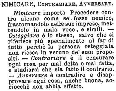 | Nimicare, Contrariare, Avversare - Nimicare importa Procedere contro alcuno come se fosse nemico, frastornandolo nelle sue imprese, mettendolo in mala voce, e simili. - Osteggiare è lo stesso, salvo che si riferisce più specialmente al far di tutto perchè la persona osteggiata non riesca in veruno de' suoi propositi. - Contrariare è il censurare ogni cosa per mal detta o mal fatta, e studiarsi che sia fatto il contrario. - Avversare è contradire e disapprovare ogni cosa, anche buona, acciocchè non abbia effetto. [immagine] |