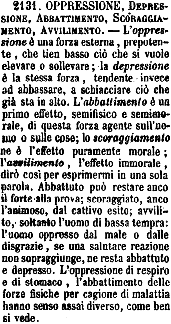| Oppressione, Depressione, Abbattimento, Scoraggiamento, Avvilimento - L'oppressione è una forza esterna, prepotente, che tien basso ciò che si vuole elevare o sollevare; la depressione è la stessa forza, tendente invece ad abbassare, a schiacciare ciò che già sta in alto. L'abbattimento è un primo effetto, semifisico e semimorale, di questa forza agente sull'uomo o sulle cose; lo scoraggiamento ne è l'effetto puramente morale; l'avvilimento, l'effetto immorale, dirò così per esprimermi in una sola parola. Abbattuto può restare anco il forte alla prova; scoraggiato, anco l'animoso, dal cattivo esito; avvilito, soltanto l'uomo di bassa tempra: l'uomo oppresso dal male o dalle disgrazie, se una salutare reazione non sopraggiunge, ne resta abbattuto e depresso. L'oppressione di respiro e di stomaco, l'abbattimento delle forze fisiche per cagione di malattia hanno senso assai diverso, come ben si vede. [immagine] |