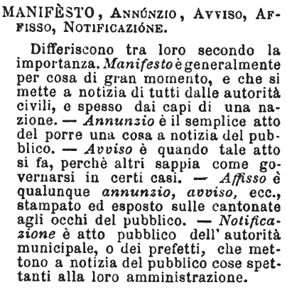| Manifesto, Annunzio, Avviso, Affisso, Notificazione - Differiscono tra loro secondo la importanza. Manifesto è generalmente per cosa di gran momento, e che si mette a notizia di tutti dalle autorità civili, e spesso dai capi di una nazione. - Annunzio è il semplice atto del porre una cosa a notizia del pubblico. - Avviso è quando tale atto si fa, perchè altri sappia come governarsi in certi casi. - Affisso è qualunque annunzio, avviso, ecc., stampato ed esposto sulle cantonate agli occhi del pubblico. - Notificazione è atto pubblico dell'autorità municipale, o dei prefetti, che mettono a notizia del pubblico cose spettanti alla loro amministrazione. [immagine] |