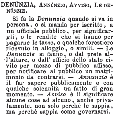 | Denunzia, Annunzio, Avviso, Le denunzie - Si fa la Denunzia quando si va in persona, o si manda per iscritto, a un ufficiale pubblico, per significargli, o le rendite che si hanno per pagarne le tasse, o qualche forestiero ricevuto in alloggio, o simili. - Le Denunzie si fanno, o dal prete all'altare. o dall'ufficio dello stato civile per mezzo di pubblico affisso, per notificare al pubblico un matrimonio da contrarsi. - Annunzio è il far sapere pubblicamente e con qualche solennità un fatto di gran momento. - Avviso è il significare alcune cose ad alcuno, anche privatamente, non solo perchè le sappia, ma perchè sappia come governarsi. [immagine] |