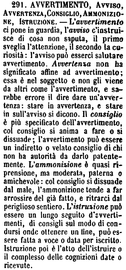 | Avvertimento, Avviso, Avvertenza, Consiglio, Ammonizione, Istruzione - L'avvertimento ci pone in guardia, l'avviso c'instruisce di cosa non saputa, il primo sveglia l'attenzione, il secondo la curiosità: l'avviso può esserci salutare avvertimento. Avvertenza non ha significato affine ad avvertimento; essa è nel soggetto e non gli viene da altri come l'avvertimento, e sarebbe errore il dire dare un'avvertenza: stare in avvertenza, e stare in sull'avviso si dicono. Il consiglio è più specificato dell'avvertimento, col consiglio si anima a fare o si dissuade; l'avvertimento può essere un indiretto o velato consiglio di chi non ha autorità da darlo patentemente. L'ammonizione è quasi riprensione, ma moderata, paterna o amichevole: col consiglio si dissuade dal male, l'ammonizione tende a far arrossire del già fatto, e ritrarci dal periglioso sentiero. L'istruzione può essere un lungo seguito d'avvertimenti, di consigli sul modo di condursi onde ottenere un fine, può essere fatta a voce o data per iscritto. Istruzione poi è l'atto dell'istruire o il complesso delle cognizioni date o ricevute. [immagine] |